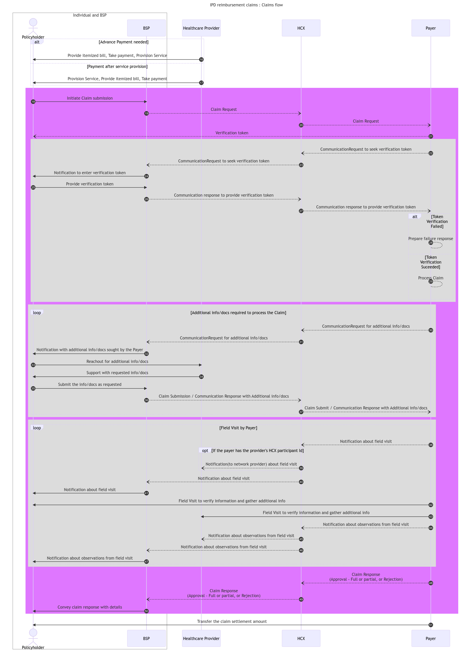 Important note : The work stream's original diagram representing the overall workflow of the reimagined IPD reimbursement flow using HCX is available here. Based on initial feedback for improving the readability, the sections below detail it in multiple diagrams representing each stage separately.
