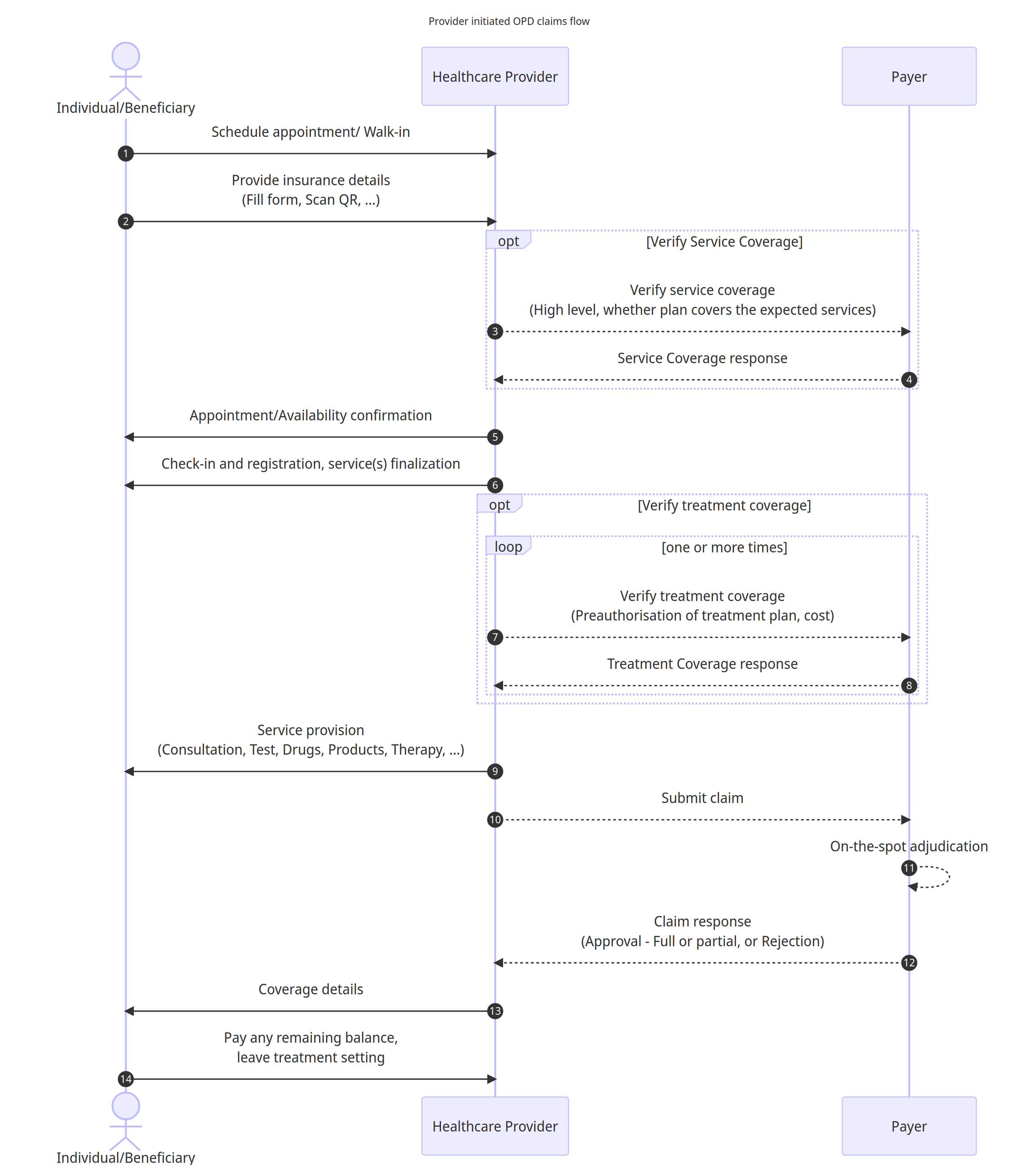 (Optional) The Healthcare Provider initiates a coverage verification process by contacting the Payer to confirm the high-level service coverage, aiming to determine if the expected services are covered under the Individual's insurance plan.