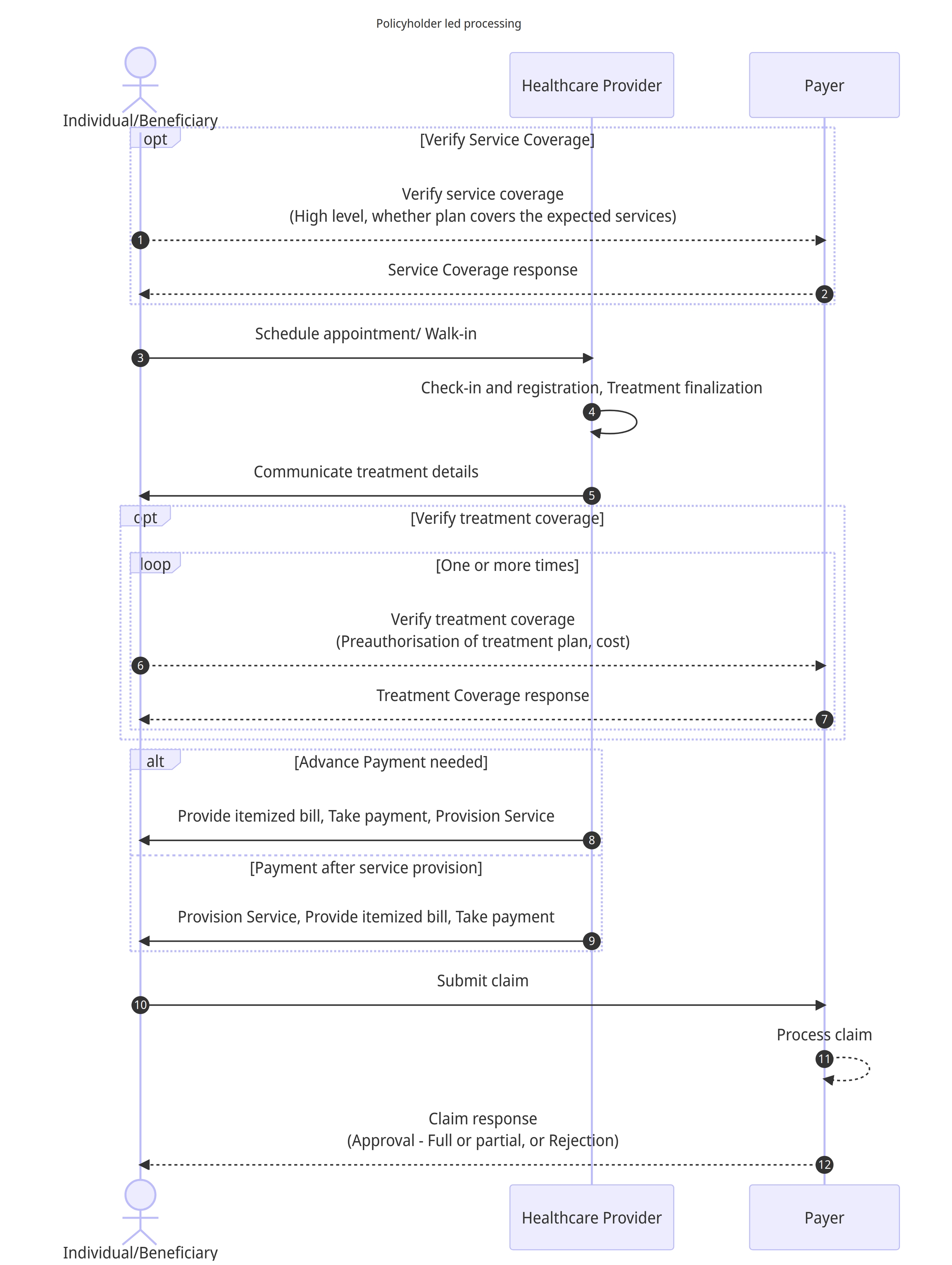 - (Optional) The Individual initiates the process by contacting the Payer to verify service coverage, seeking high-level information about whether the insurance plan covers the expected services. The policyholder could also do this step after seeking the appointment/walk in.