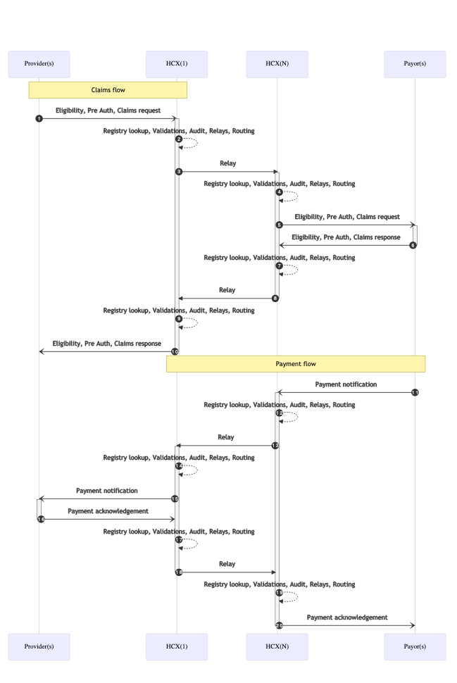 In case Sender and receiver are listed/registered on different HCX instances, there may be request/response relays between the HCXs. Steps 2, 5, 8 and 11 in the below diagram may involve such relays. The diagram below provides an example of a provider-payor use case with a relay between two HCXs.